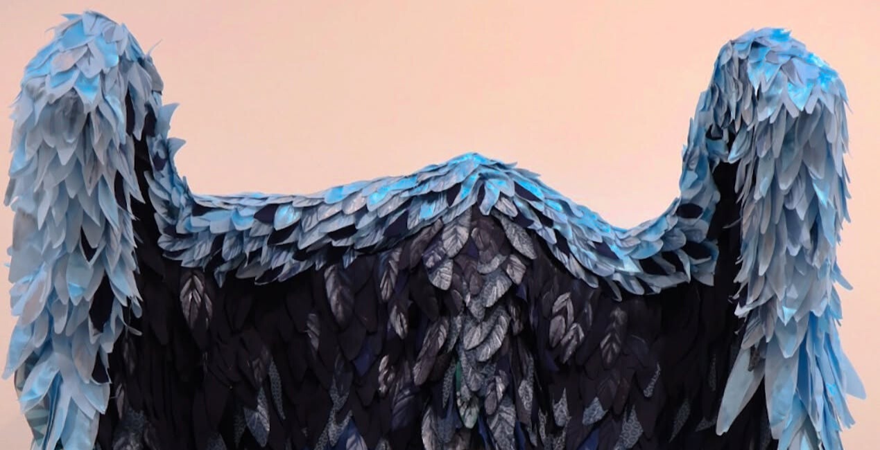 “I stayed up through the night, taped my fingertips because I was bleeding from the wire. It wasn’t an option to not have my wings ready in time,” she recalls. “I filled the gallery with 55 pieces, but these wings were special.”